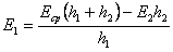 Рис. 1. Эпюра модулей конструкции щебеночного основания, обработанного в верхней части неорганическими вяжущими: h - общая толщина основания, см: h1, h2 - толщины верхней обработанной и нижней необработанной частей слоя основания, см; Е1, Е2 - модули упругости обработанной и необработанной частей слоя основания, МПа; Еср - средний модуль упругости слоя основания, МПа