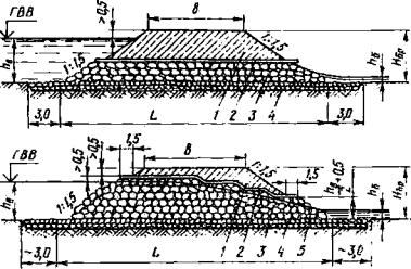 Назначаем глубину воды перед фильтрующей частью из условия незатопляемости бровки земляного полотна и устойчивости основания по формулам (1) и (2):