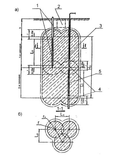 5.3.3. При большой мощности просадочной толщи для повышения качества и эффективности инъекционных работ в пределах каждого фундамента могут устраиваться секции с лидерными скважинами, заполненными дренажным материалом и обеспечивающими пропитку массива грунта по площади и глубине.