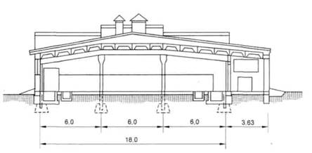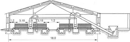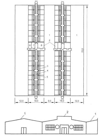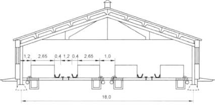 2.1.5 Эксплуатируемые фермы, как правило, имеют павильонную и моноблочную застройку. Ширина отдельно стоящих зданий составляет 9, 12, 15, 18, 21 м и более. Здания расположены на значительном расстоянии друг от друга и во многих случаях без определенной ориентации. Многие фермы не имеют кормоцехов и базируются на применении ручного труда или частичной механизации отдельных трудоемких процессов.