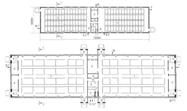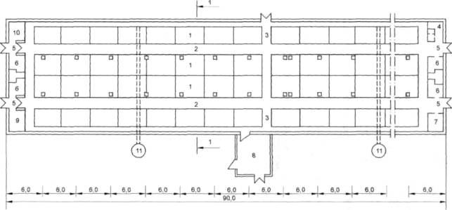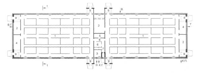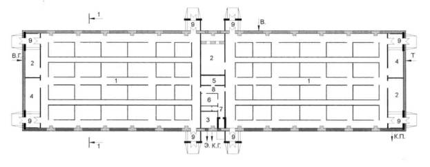 1 - помещение для содержания свиней; 2 - венткамера; 3 - служебная комната; 4 - щитовая; 5 - санузел; 6 - машинное отделение; 7 - коридор; 8 - инвентарная; 9 - тамбур