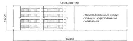 Рисунок Е.9 - Свинарник на 400 супоросных маток используется для осеменения маток (одно здание для осеменения, второе - разбивается на два равных помещения, одно из которых используется для осеменения, а второе - для станции искусственного осеменения)