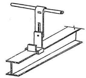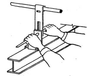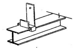 2.13. Направляющие профили размечают по длине и разрезают их ножовкой. Затем профиль закрепляют на подвесках в проектное положение по отметкам, вынесенным на стенах. С помощью гаечного ключа соединяют болтами подвеску со скобой-подвеской (рис. 5). Последующие направляющие профили устанавливают, соблюдая заданный уровень и фиксируют расстояние между направляющими с помощью гребенки, которую устанавливают через каждый метр по длине направляющих.