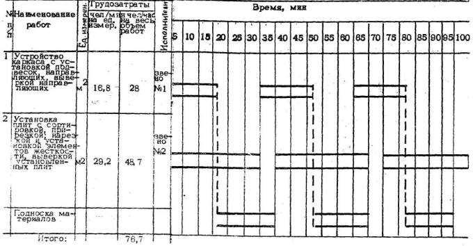 Первое звено выполняет работы по монтажу чистого каркаса; второе звено подготавливает плиты и устанавливает их.