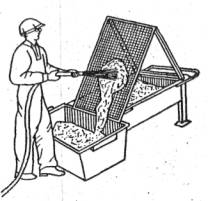 Штукатур Ш2 подает раствор растворонасосом через бескомпрессорную форсунку на сито. Сито устанавливается на емкости под углом 60°, откуда берется раствор для работы. В емкости процеженный раствор доводится до нужной консистенции путем добавления известкового молока |