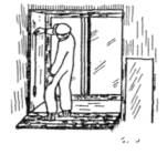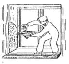 Положив раствор из рабочего ящика на сокол, штукатур берет кельмой небольшие порции раствора с сокола и набрасывает на боковую часть проема, увеличивая толщину набрызга к окопной коробке согласно углу просвета |