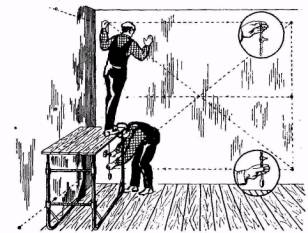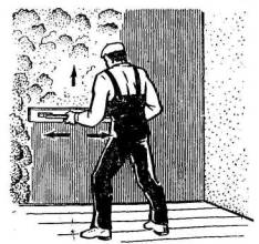Сопло-форсунку держат на высоте 60-70 см над полом и под углом примерно в 60° (рис. 62). В случае необходимости шпаклевку разравнивают шпателем или гребком.