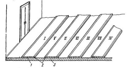 Проверить основание контрольным правилом, прикладывая его п различных направлениях к поверхности пола. Качество поверхности должно отвечать требованиям, указанным в инструкционно-технологической карте 1. Все отклонения от правильной поверхности отметить мелом. Небольшие неровности снять мозаично-шлифовальной машиной, пользуясь крупнозернистыми абразивами №№ 24 или 36. При толщине подлежащего укладке покрытия, превышающего 4 мм, уложить маячные рейки толщиной, соответствующей толщине покрытия, через 1,5-2,0 м друг от друга но уровню, руководствуясь указаниями, содержащимися в инструкционно-технологической карте № 11. С основания удаляют мусор и дочиста промывают водой. Устанавливают вдоль стен защитные инвентарные щиты. Непосредственно после промывки влажное основание грунтуют полимерцементной грунтовкой, пользуясь указаниями, содержащимися в настоящей карте и используя для этой цели установку С-562 с соплом-форсункой.