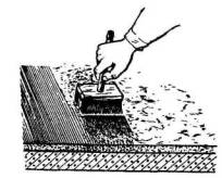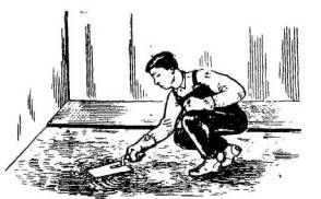 Через сутки после нанесения лицевого слоя и его шлифовки поверхность пола покрывают лаком. Лак наносится флейцем на длинной ручке (рис. 63). Лак наливается в широкую посуду, например в таз. Флейц опускается в лак не глубже чем на 1-1,5 см, слегка отжимается о деревянную веселку, поставленную в посуду (но не о край посуды). Нанесение лака производят тонким слоем взаимообратными движениями вначале в одном направлении, а затем - в перпендикулярном.