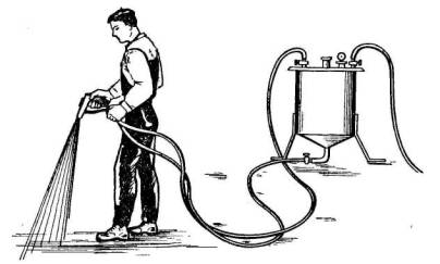 На следующий день после огрунтовки приступают к шпаклеванию поверхности пола. Вначале шпателем с текстолитовым наконечником производят выправку отдельных мест полимерцементной мастикой, как более жесткой. Для этого нанесенную на поверхность ковшом шпаклевку разравнивают шпателем во взаимноперпендикулярных направлениях. После подсыхания выправленных мест приступают к нанесению поливинилацетатной шпаклевки. Эту работу выполняют с помощью установки C-562 и сопла-форсунки. Бачок установки заполняют шпаклевкой (рис. 61), закрывают крышку, подключают шланги компрессора и сопла-форсунки и включают компрессор. После того, как давление в системе поднимется до 4 атм., приступают к регулировке факела сопла-форсунки. Для этого вначале открывают воздушный кран, и после того как из него начнет поступать воздух, открывают материальный кран. Меняя соотношение количества поступаемого воздуха и мастики добиваются хорошо заполненного мастикой факела, пользуясь приведенными выше указаниями о влиянии количества воздуха и материала на формирование факела. Для тренировки процесса регулирования факела эту работу следует производить над ведром или другой емкостью, пока учащийся не научится быстро регулировать факел. Нанесение шпаклевки выполняется полосами, начиная из дальнего конца помещения и передвигаясь к выходу.