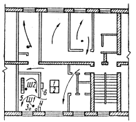 Ш-1, Ш-2 - исходное положение рабочих. 1 - ящик для известкового раствора; 2 - ящик для воды; 3 - пакля: 4 - ведро с гипсовой заводкой; 5 - сетка; 6 - гипс. ← направление ведения работ.