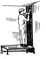 Штукатур Ш-2 берет приготовленную сетку, перегибает ее пополам и, приложив к углу примыкания, прибивает гвоздями по краям сетки к гипсовой перегородке и кирпичной стене. Утопив гвоздь на 0,7 длины, штукатур загибает верхнюю часть, благодаря чему сетка плотно прилегает к поверхности |