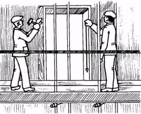 4.2. Выверку вертикальных (боковых) откосов оконных проемов и деревянных реек под русты производят путем провешивания их при помощи 400-600-граммового отвеса, опушенного через все этажи от окна верхнего этажа. Для выверки горизонтальных откосов, сливов и деревянных реек натягивают шнур по линиям их граней вдоль фасада.