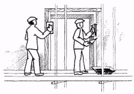 УСТАНОВКА ДЕРЕВЯННЫХ РЕЕК; 7 мин; Ш1 и Ш2; рейки деревянные, молоток, отвес, уровень, правило. Штукатуры Ш1 и Ш2 по отметкам прикрепляют деревянные рейки вокруг оконных и дверных проемов для оштукатуривания откосов и выполнения маячных поясков |