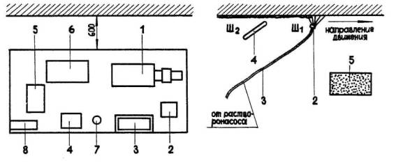 1 - растворосмеситель; 2 - ящик со слюдой; 3 - известковое молоко; 4 - песок; 5