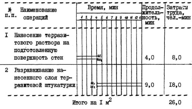 Снижение затрат труда и повышение выработки рабочих достигается за счет механизированного нанесения слоев терразитовой штукатурки без устройства подготовительного слоя-штукатурки и сокращения численного состава звена штукатуров по сравнению с ЕНиР.