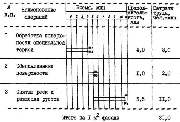 РАЗДЕЛКА РУСТОВ; 5,5 мин; Ш1 и Ш2; клещи, молоток, кельма. Штукатуры Ш1 и Ш2 снимают рейки с оштукатуренной и отциклеванной поверхности при помощи клещей и кельмы. При необходимости подправляют и подкрашивают русты |