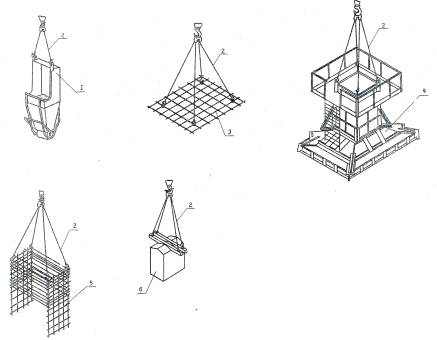 2.12. Монтаж опалубки фундаментов производится готовыми блок-формами. Перед монтажом блочной опалубки проверяют крепление башмака с подколенником и смазку рабочей поверхности опалубки. Собранная блок-форма монтируется стреловым краном в проектное положение с помощью универсального четарехветвевого стропа в два приема: