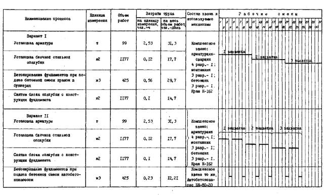 2.9. Работы по устройству монолитных фундаментов при 1-ом и 2-ом вариантах выполняет комплексное звено из трех человек; арматурщика-сварщика 4 разр. - 1; монтажника 3 разр. - 1; бетонщика 3 paзp. - 1.