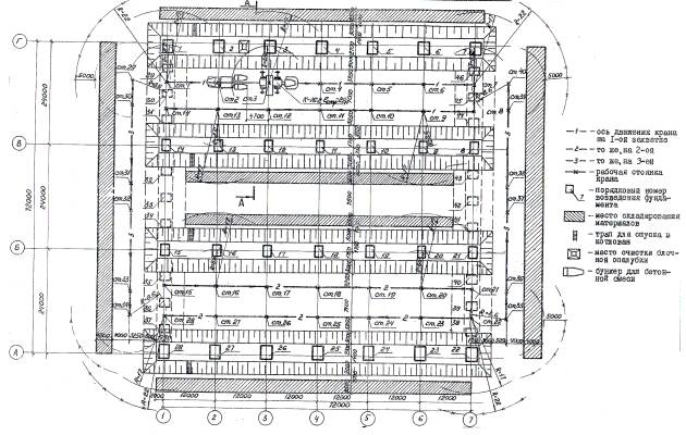 Технологическая схема производства работ при подаче бетонной смеси краном в бункерах . |