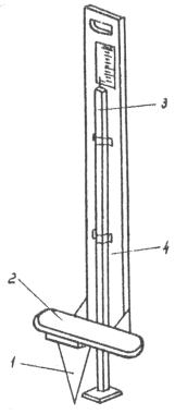 Условная прочность грунта может быть определена ударником У-1 (рис. 1), который состоит из наконечника 1 с нанесенными на нем делениями через 1 см, гири 2 массой 2,5 кг для забивки наконечника в грунт и направляющего штока 3 для движения по нему гири.