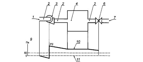 Р1 - давление защитного газа (определяется по сопротивлению потока через газопровод, части внутри оболочки и в ряде случаев - через дроссельную заслонку и защитный барьер от искр и частиц); 1 - вход защитного газа (в безопасной зоне); 2- газопровод; 3 - вентилятор; 4 - оболочка; 5 - дроссельная заслонка (в том случае, когда требуется поддерживать избыточное давление); 6 - (не используется на этом рисунке); 7 - выход защитного газа; 8 - защитный барьер от искр и частиц; 9 - избыточное давление, Па; 10 - внутреннее давление; 11 - наружное давление