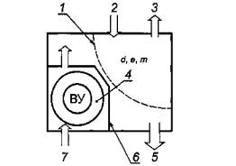 1 - внутренняя перегородка; 2 - вход продувочного газа; 3 - неповреждаемые части встроенной системы; 4 - выход продувочного газа; 5 - расположение ВУ; 6 - потенциальный источник утечки с номинальной зоной разбавления