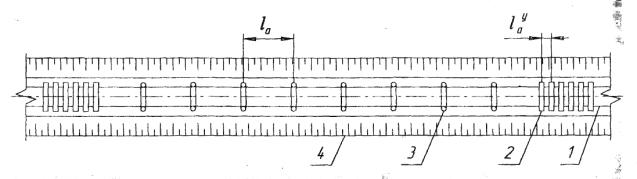 2 - железобетонные пригрузы типа УБО; 3 - Анкер-инъекторы; 4 - траншея; la - расстояниемежду анкер-инъекторами;