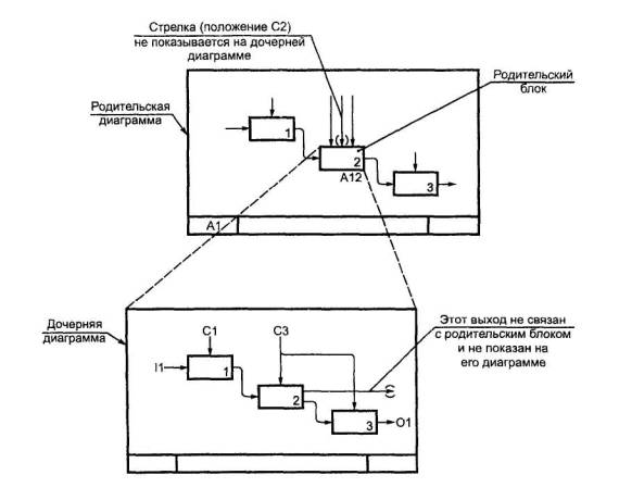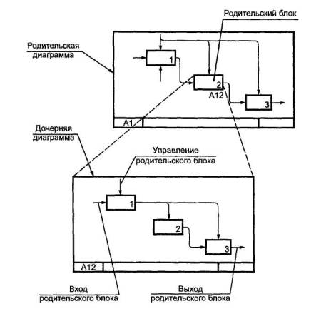 2.14 дочерняя диаграмма: Диаграмма, детализирующая родительский (порождающий) блок.