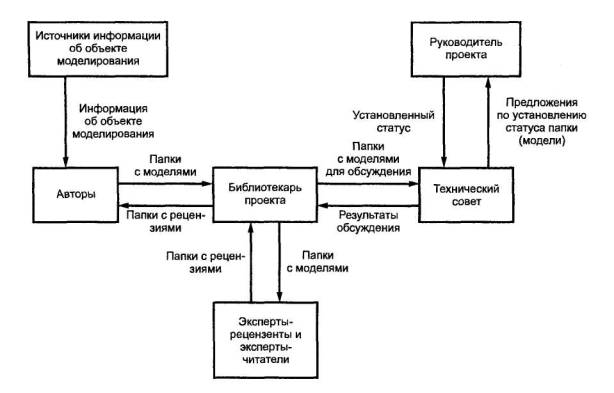 Этот элемент организации процесса создания моделей предлагает арбитражные решения по моделированию и рекомендации по установлению статуса диаграмм, части и/или модели в целом (статусы: «Рабочий проект», «Эскиз», «Рекомендовано» и «Публикация»).