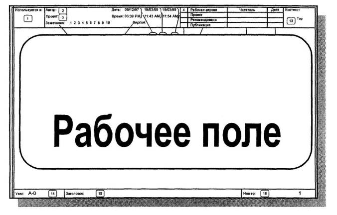 Поле содержит всю информацию, относящуюся к диаграмме: изображения блоков и стрелок, метки, примечания и т.д. Оно служит также для размещения глоссария, текстовых комментариев, замечаний, иллюстраций, эскизов и т.д. Автор не должен использовать никаких других бумаг, кроме стандартного бланка.