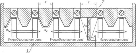 - в разделительных элементах, за исключением трансформаторов, соответствующих таблице F.1 или F.2, в зависимости от уровня искробезопасной цепи.