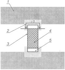 1 - свободная поверхность; 2 - герметизирующий материал: половина значения, указанного в графе 3 таблицы 5, при минимальном значении 1 мм; 3 - компонент, герметизирующий материал, не должен проникать внутрь; 4 - герметизирующий материал (толщина не задана); 5 - металлическая или изоляционная оболочка: для металлической оболочки толщину не указывают (см. 6.1), толщина изоляции - по таблице 5 (графа 4) настоящего стандарта