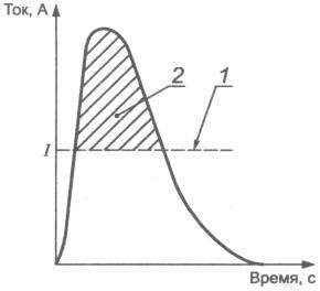 1 - ток I, максимально допустимый в соответствии с испытанием на искробезопасность и оценкой по приложению А; 2 - передаваемая энергия (Дж) - напряжение V (В) × заштрихованный участок кривой (А, с)