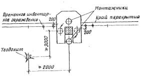 Устройство инвентарного ограждения прямоугольной ячейки перекрытия наверху плит по периметру. Ограждение крепится к плитам, ригелям, колоннам. В месте установки лестницы делается разрыв, который перекрывается перекидной доской (по типу шлагбаума) или доской выдвижного типа (телескопического). |