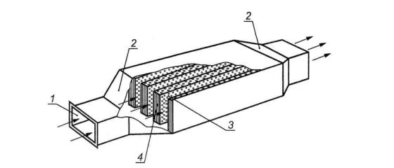 3.2 диссипативный глушитель (dissipative silencer, absorptive silencer): Глушитель, обеспечивающий широкополосное ослабление звука при относительно малых потерях давления частичным преобразованием звуковой энергии в тепловую посредством трения в пористых или волокнистых облицовках канала.