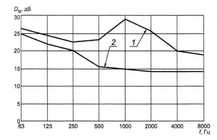 1 - 1/3-октавные полосы; 2 - октавная полоса