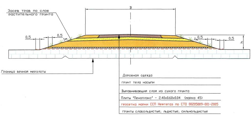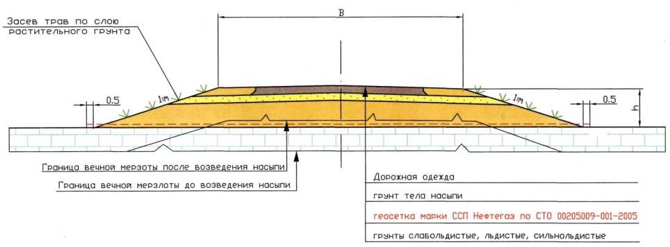 13.2 В случаях использования для постоянных дорог в теле насыпи глинистого грунта верхняя часть насыпи отсыпается из крупнообломочного или песчаного грунта слоем по расчету но не менее 0,4 м. При этом для северного региона запрещается удалять или разрушать мохо-растительный покров в основании насыпи.
