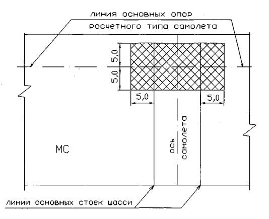 - на площадках доводочных работ и в местах запуска двигателей на местах стоянок (МС), вдоль линии основных опор расчетного типа самолета. Геометрические размеры участков сплошного армирования в каждом случае принимаются индивидуально в зависимости от их предназначения и от габаритов расчетного воздушного судна (ВС).