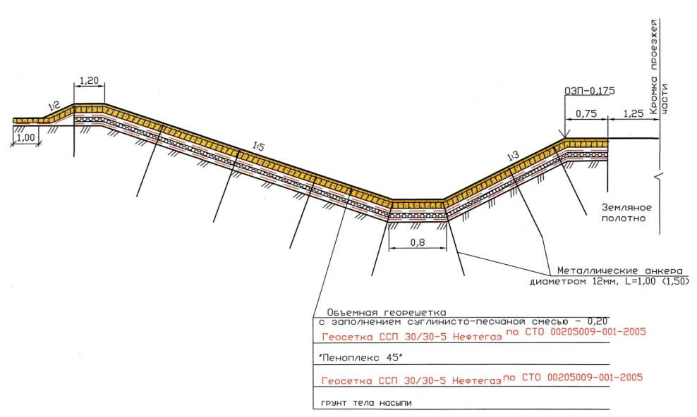 - нарезка заглубления на обочине и в основании земляного полотна для крепления геосетки;