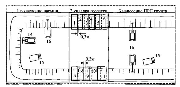 1-11 - рулоны (полотна) геосетки ССП «Нефтегаз»; 14 - бульдозер; 15 - автомобиль-самосвал. 16 - экскаватор.