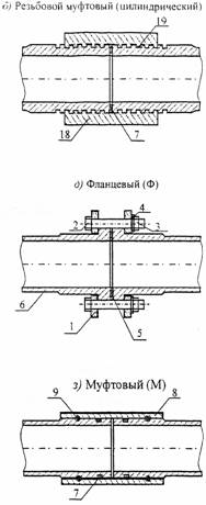 5.4. К разъемным соединениям труб относятся фланцевые и резьбовые. Первые монтируются (соединяются) с помощью болтовых соединений на стальных или пластмассовых фланцах (рис.5.1. г, д), что позволяет при эксплуатации трубопровода (при очистке, переукладке, реставрации и т.п.) производить разборку соединений с последующим восстановлением стыка без нарушения труб и сопредельных (соседних) соединений.