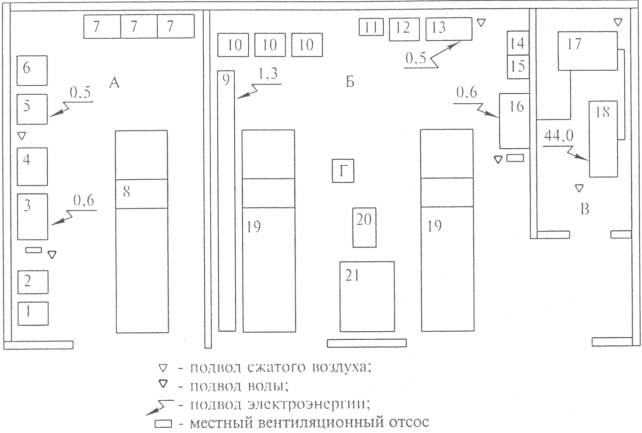 - подача газа; Б - разряжение; В - подача охлаждающей жидкости