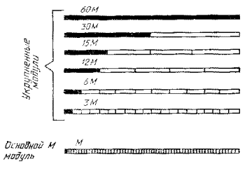 2.4. Укрупненные модули для размеров в плане каждого конкретного вида зданий, его планировочных и конструктивных элементов, проемов и т.д. должны составлять группу, выбранную из общего ряда, установленного п. 2.2, таким образом, чтобы каждый относительно больший модуль был кратен всем меньшим, чем достигается совместимость членений модульных сеток (черт. 3).
