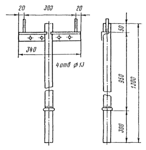 1.1.4. Стойки типа PCI (рис. 1.1 - 1.3) применяют при напряжении цепи PC до 240 В включительно, габарите линии 0,8 мм и при размещении на каждой траверсе одной цепи. Траверсу к стойке со стволом длиной 1300 мм допускается крепить при помощи электросварки (рис. 1.2).