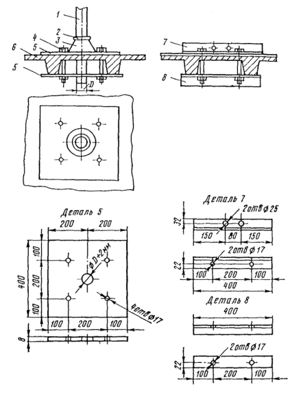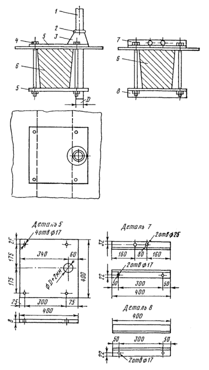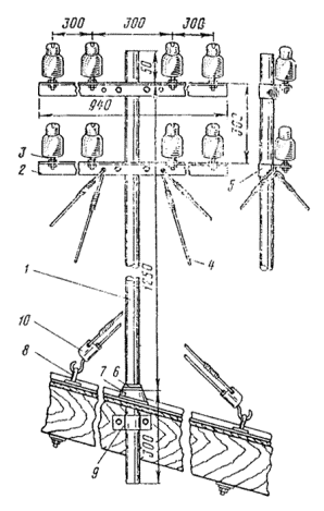 1 - ствол стойки; 2 - траверса съемная для стоек PCI; 3 - штырь; 4 - оттяжка; 5 - хомут траверсы; 6 - опорное кольцо; 7 - копыто; 8 - болт стропильный; 9 - хомут для крепления стойки; 10 - винтовая стяжка дли натяжения оттяжек.