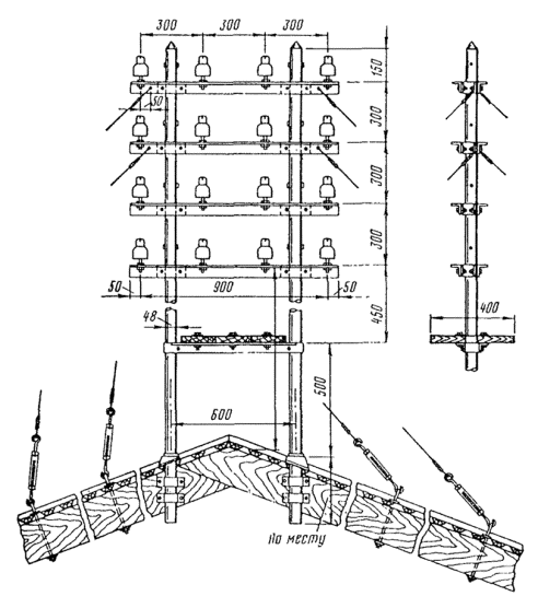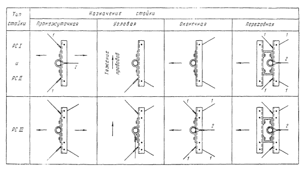 На траверсах стоек типа PCIII во всех случаях размещается одна цепь PC с двойным креплением проводов. Подвеска на стоечных линиях цепей с напряжением выше 960 В запрещается.
