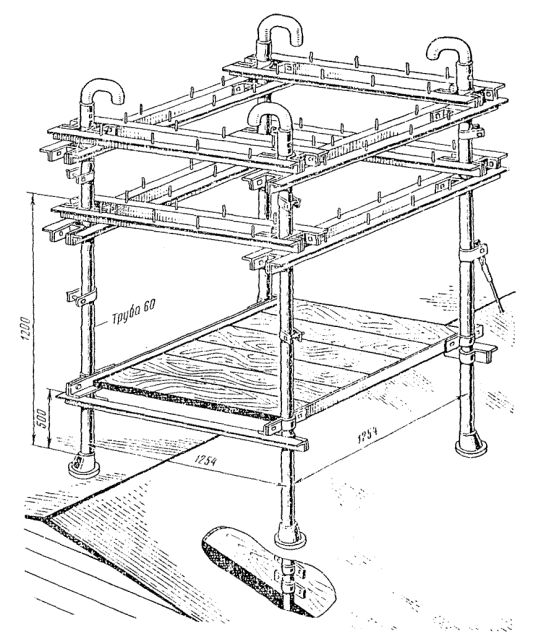 После закрепления восстановленной оболочки сросток погружается в специальный бачок, наполненный водным раствором поваренной соли. Соотношение соли и воды 1 : 2. При работе бачок подвешивается к монтажному станку.