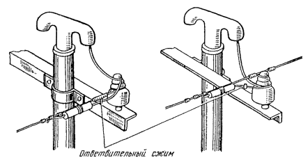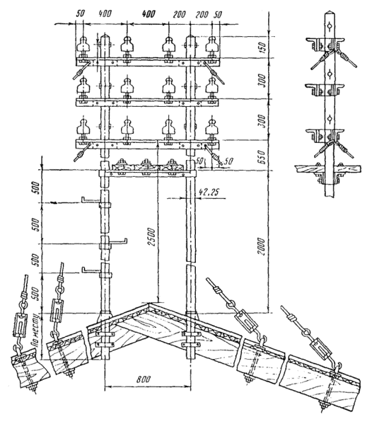 1.1.2. В качестве угловых, оконечных, переходных стоек и стоек для совместной подвески используются промежуточные стойки с усиленным креплением их оттяжками и с дополнительными траверсами.