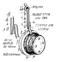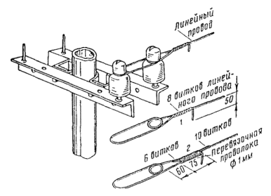 Пупиновская катушка без сердечника делается из кабеля ПРВПМ-0,8 (ПРППМ-0,8). Число витков 230. Индуктивность 10 мГ. Сопротивление катушки постоянному току 4,5 Ом, сопротивление изоляции не менее 50 МОм (рис. П.3.1).